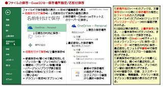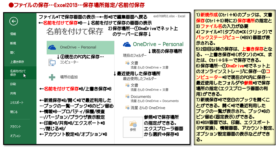6)保存場所…(1)OneDrive*Bでネット上のオンラインストレージに保存できる。…(2)コンピューター*Bで現在のPC内に保存できる。…最近使用したフォルダや参照*Bで保存場所の指定(エクスプローラ画面の利用)ができる。↓