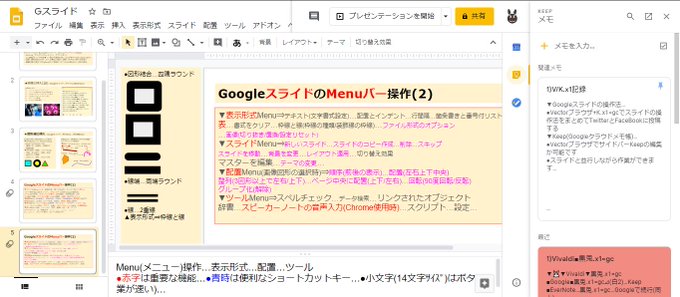 ●Googleスライドの表示形式、スライド、配置、ツールのメニュー(Menu)操作項目を簡単にまとめました …Vectorブラウザで右サイドバーにGoogleKeep(クラウドメモ帳)を表示して並行して作業ができます …1)V/K.x1…#鳥取 #コロナ #Google #スライド pic.twitter.com/7CtDXuJd0V